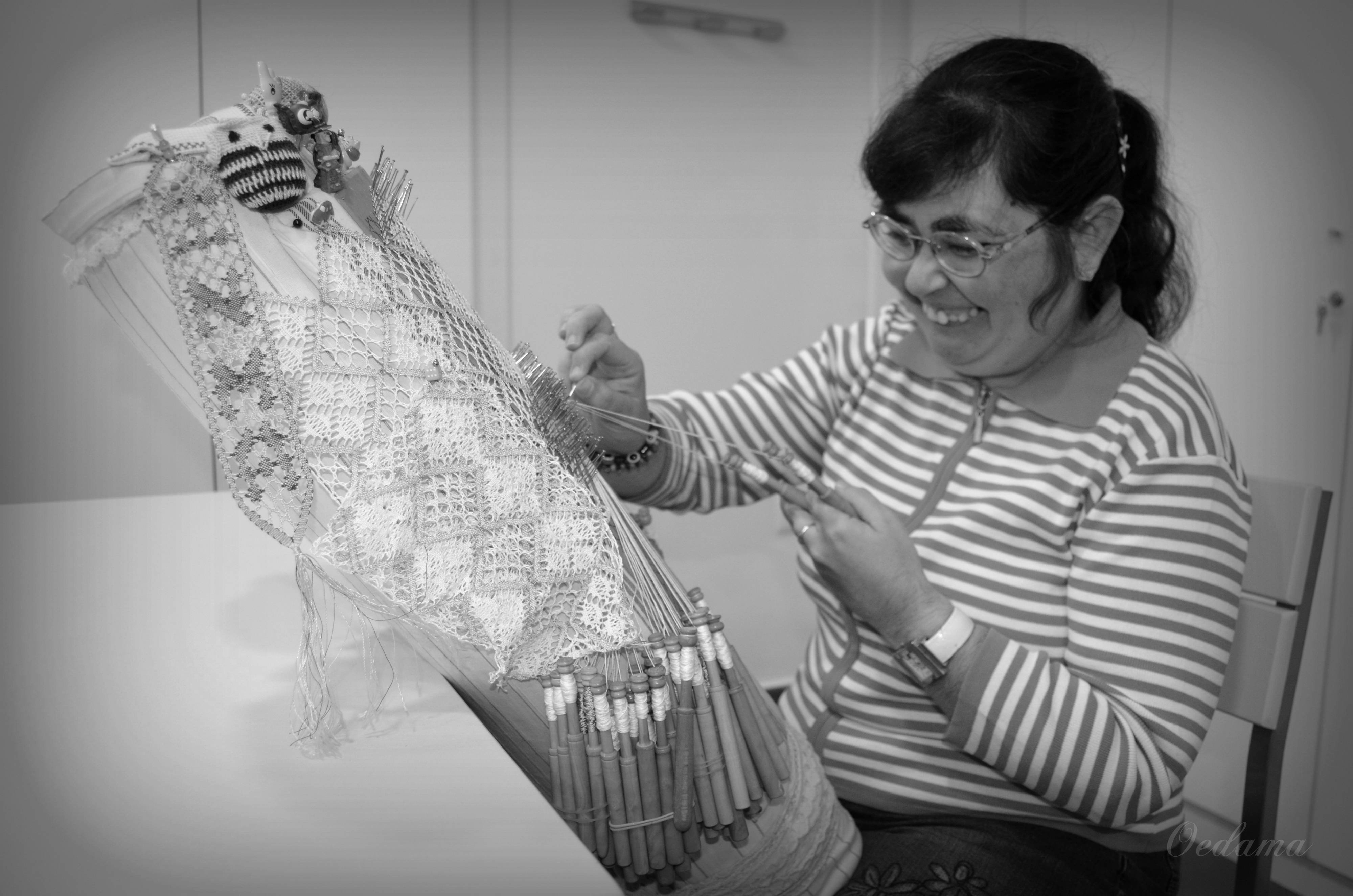 y os quiero enseñar lo que hago: es encaje de bolillos. He ido aprendiendo poco a poco de las enseñanzas de mi madre, que es profesora. El encaje de bolillos es una labor que se realiza desde época muy antigua. Hubo un tiempo en que casi desapareció por completo, pero en la actualidad está surgiendo con fuerza. ¿Qué os puedo decir? pues que es relajante, bueno para la mente y las manos y que sirve para todas las edades. Yo de lo que estoy muy orgullosa de es mi experiencia, llevo dieciocho años haciéndolo, y se pueden realizar cosas muy variadas, desde tapetes a puntillas o cortinas… yo ahora estoy haciendo ¡una blusa! Mi labor es muy importante para mí, porque me gusta mucho, pero sobre todo porque me hace sentirme útil y capaz de hacer cosas que no todo el mundo hace.»