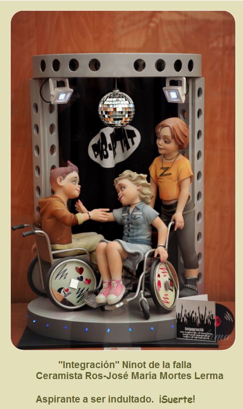 Este año, ha habido un ninot que nos ha gustado especialmente. Es el que lleva por lema «Integración» y representa un grupo de chicos y chicas divirtiéndose bailando. Pertenece a la Comisión Fallera de Ceramista Ros- José María Mortes Lerma y ha sido creado por el artista fallero Pedro M. Rodriguez Marín, siendo colaboradora Mª José Lavata García.