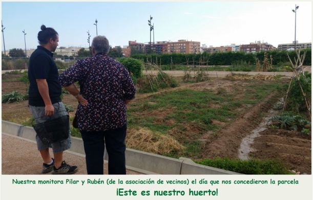 Gracias a nuestros monitores Pili y Amadeo, y gracias también a la Asociación de vecinos de La Torre (Valencia) y a Rubén su técnico, disponemos ahora de una parcela de los huertos urbanos situados en la urbanización «Sociópolis». Son unos huertos preciosos, en un entorno la mar de agradable como podéis ver en la foto.