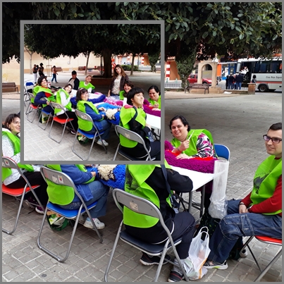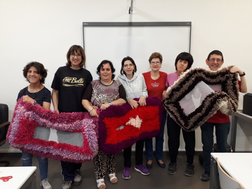 Planificamos todo al detalle: las alfombras para enseñarlas, lana, cañamazo y aguja para poder enseñar a todos los que quisieran aprender y pancartas con el nombre de nuestra Fundación ¡qué se sepa quiénes somos!