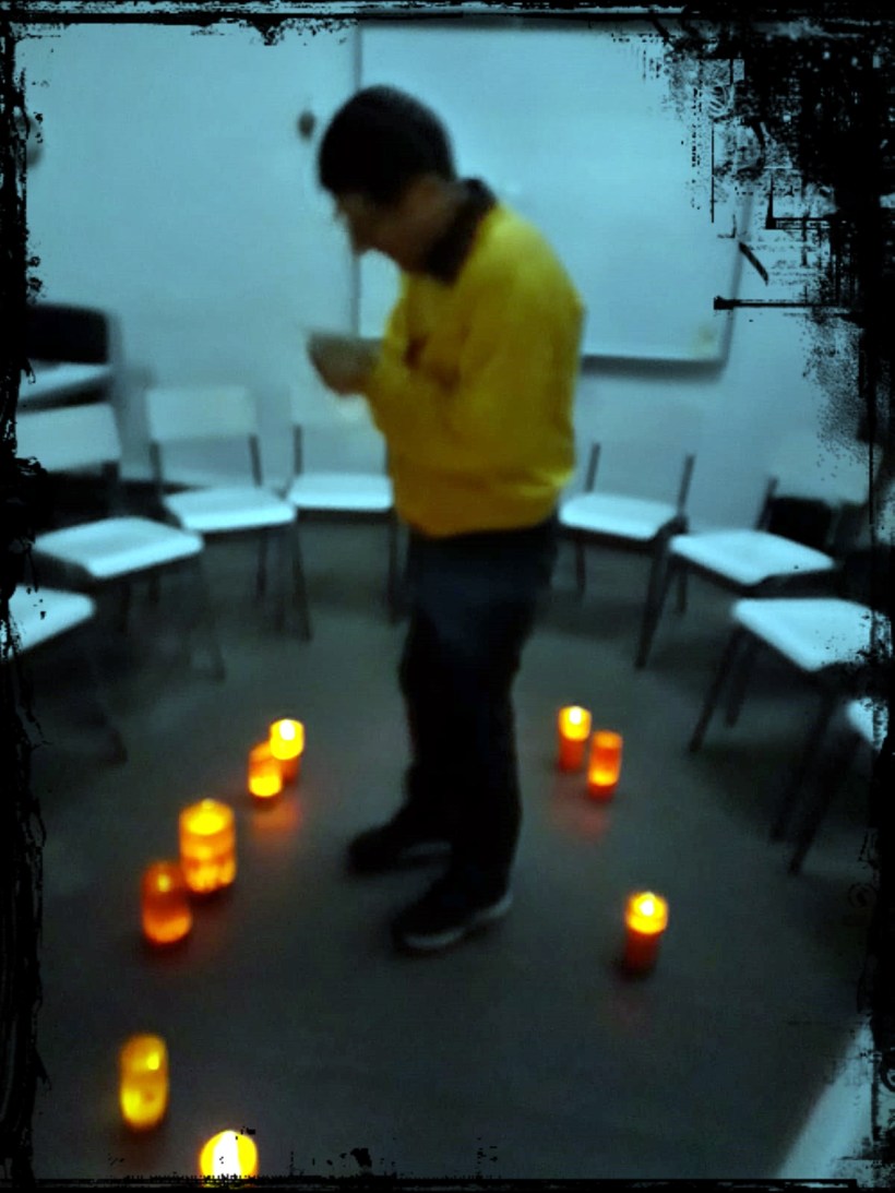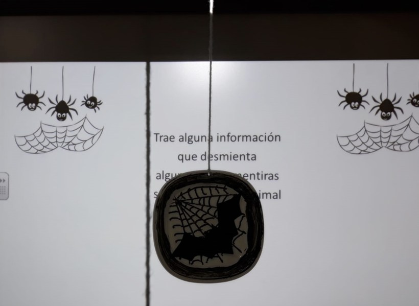 A José Mauro, que se encontró con un aula oscura llena de velas y con un montón de monstruos de la noche (esqueletos, fantasmas, murciélagos, arañas y telarañas) colgados por las paredes. Y no era el único que estaba algo asustado, Javi vió unas piernas cortadas y Pilar T. L. adivinó que eran de la bruja…