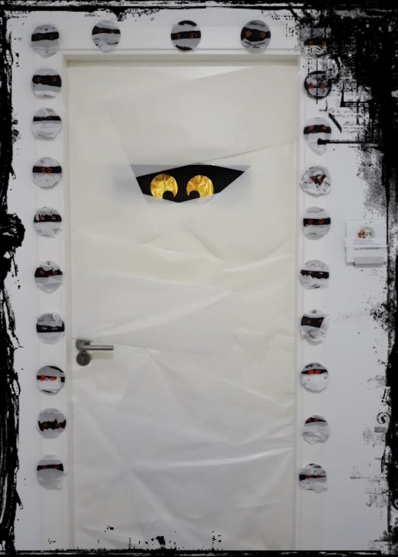Buscamos información por Internet y descubrimos un montón de ideas. Entre ellas escogimos: transformar la puerta en una momia, en la cual tuvimos que trabajar en cadena y Pilar T. L. se dejó los dedos con tanto celo que llevaba pegado.