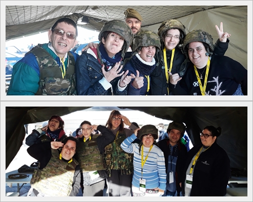 En Cheste pudimos dar un paseo por las inmediaciones del circuito donde estaban todos los coches aparcados. En medio del parking, José Mauro recuerda perfectamente una tienda de campaña que habían montado las fuerzas armadas donde tuvimos la posibilidad de ponernos los cascos y chalecos, propios de la Brigada del Ejército de Tierra.