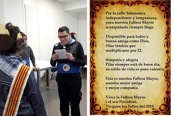 Terminada la presentación, tuvo lugar l’exaltació. Una especie de poesía con mucho amor y poca rima, que a la Fallera Mayor siempre anima. El mantenidor fue David (Presidente 2018) aunque con un poco de ayuda de la monitora Pilar. ¡La emoción le embargaba…!