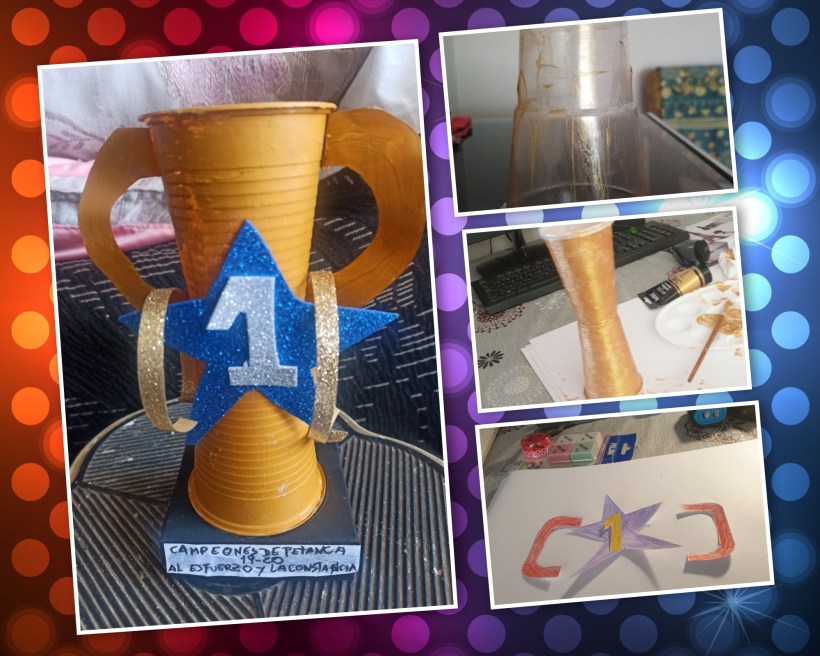 Primero, primerísimo nos ponemos “manos a la obra” para elaborar nuestros trofeos. Unos poquitos de vasos de plástico, una manica de pintura dorada, goma eva y cartulina y voilà: