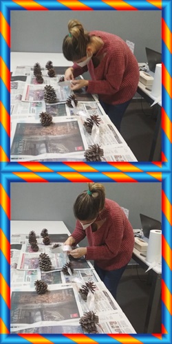 Nosotr@s las elaboramos con piñas porque nos sobraron de años anteriores pero cualquier cosa (o incluso hacer un dibujo navideño y recortar) os serviría para realizar la guirnalda. En nuestro caso, le dimos un toque de escarcha para darle brilli brilli a las piñas, las atamos con una cinta brillante y lo único que falta es buscar un hueco en la pared y colgarla.